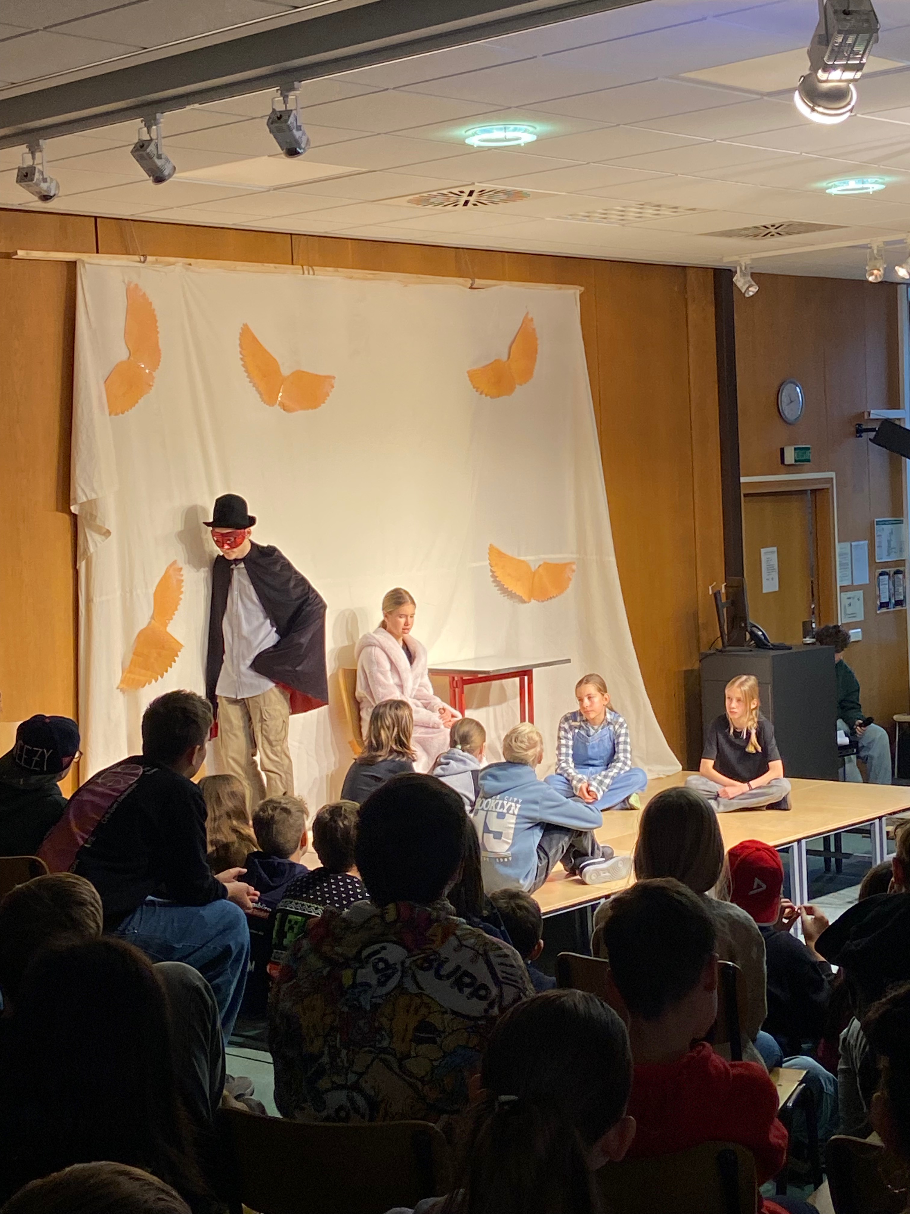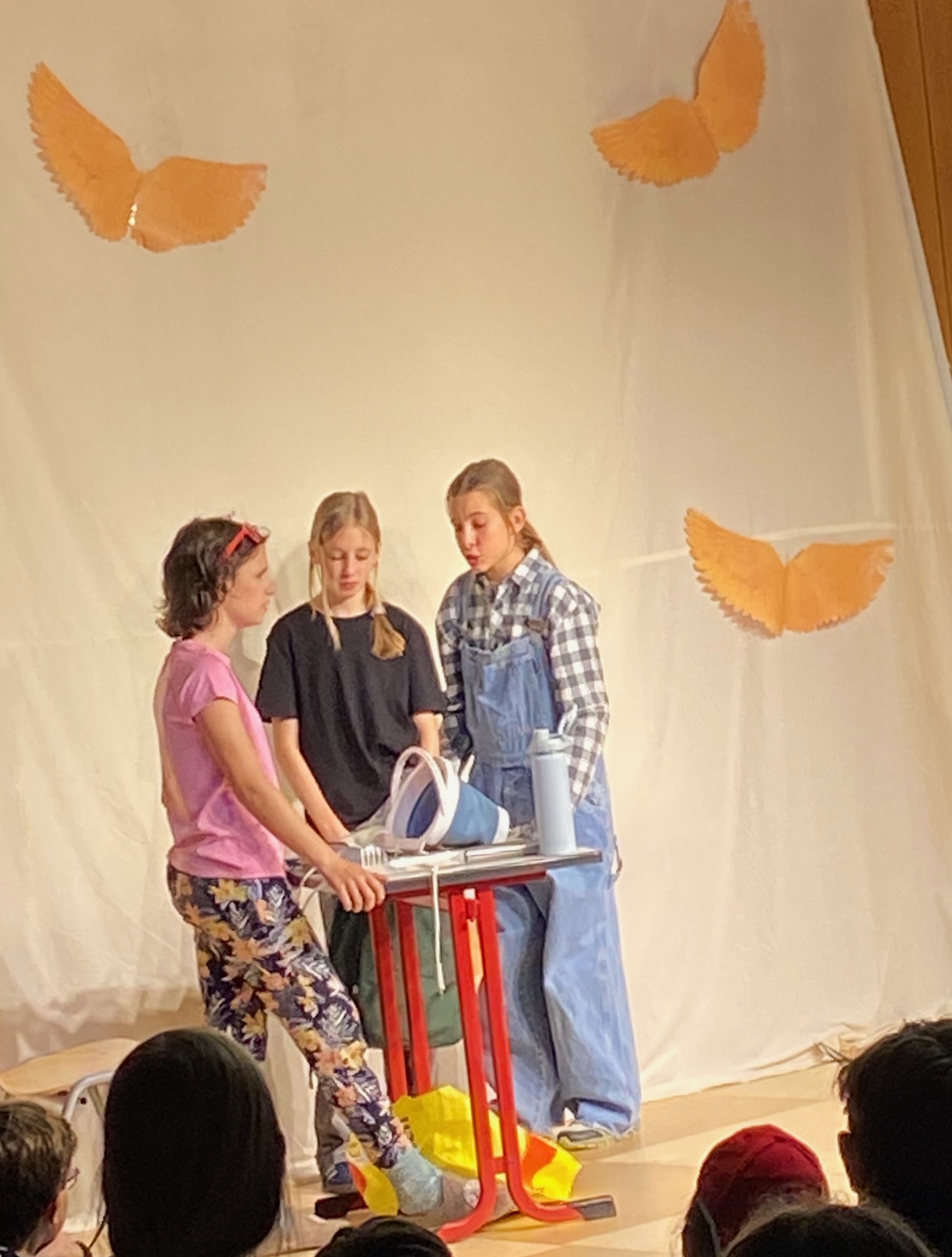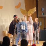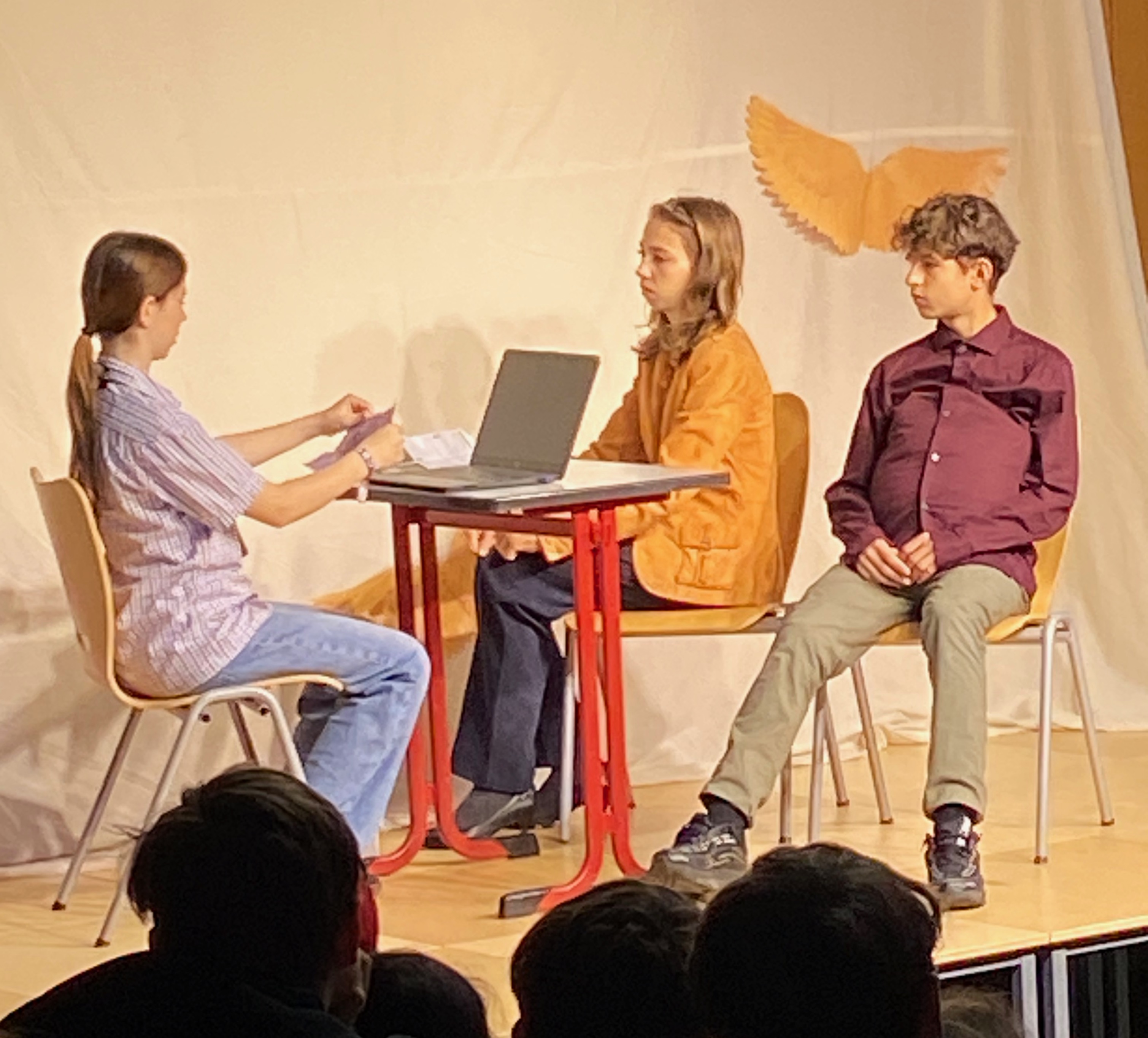 Das Bühnenbild, bestehend aus einer Leinwand mit goldenen Flügeln, auf der sich zwischenzeitlich ein Kinderkarussell drehte, und einem Unterschlupf voller Decken, schuf eine lebendige Atmosphäre und spiegelte die geheimnisvolle Welt der Geschichte wider. Für den passenden musikalischen Rahmen sorgte Kris-Milo P., der als Verantwortlicher für die Technik mit rasanten Musikeinspielungen die Spannung und Dynamik des Stücks wirkungsvoll unterstrich.