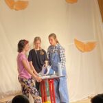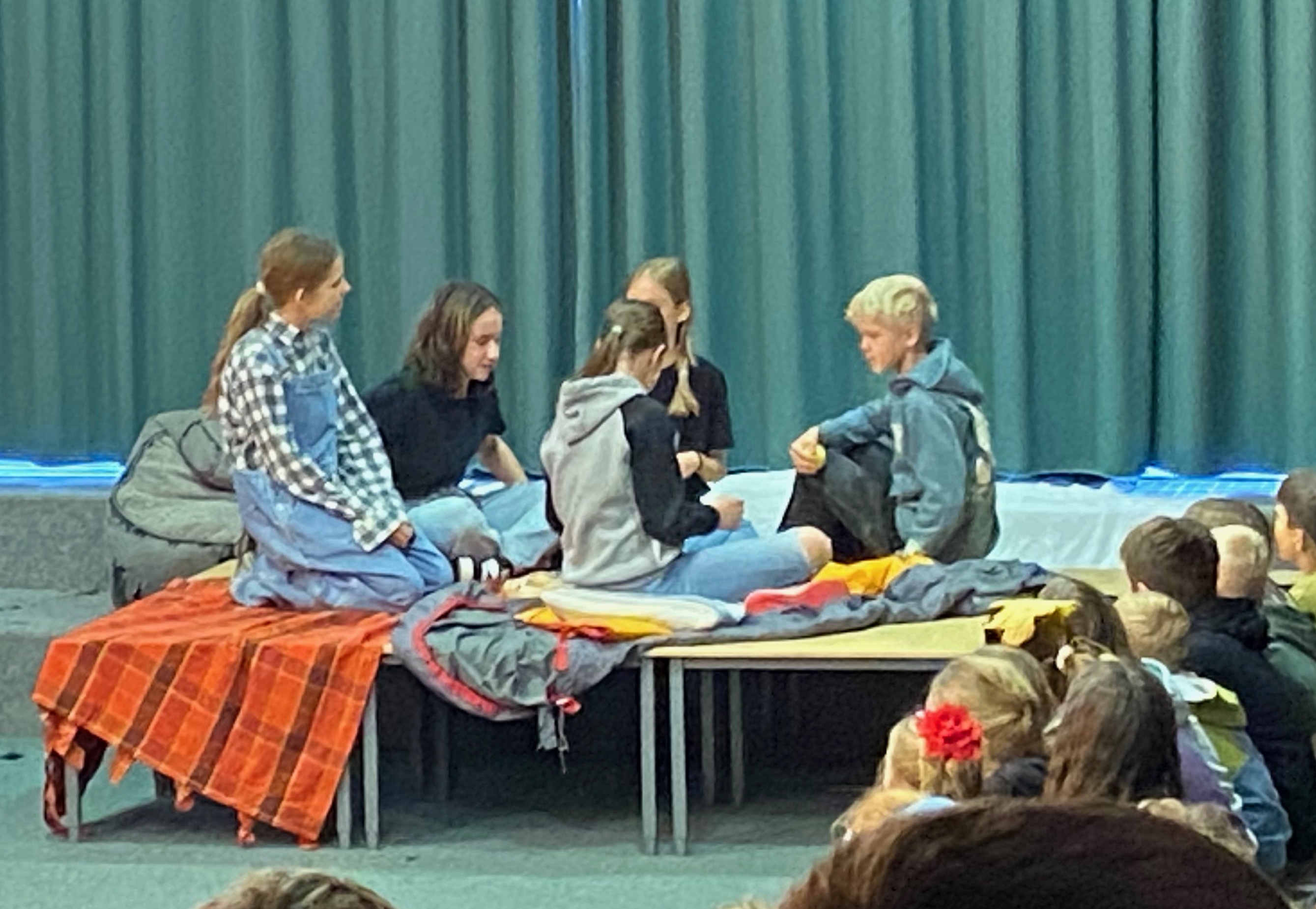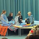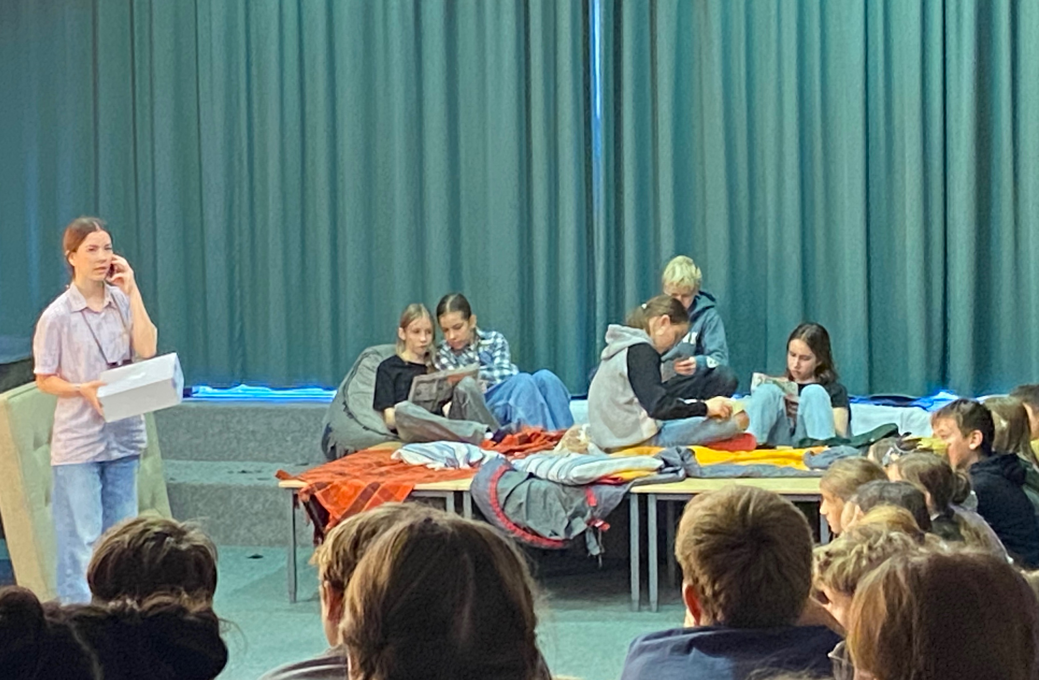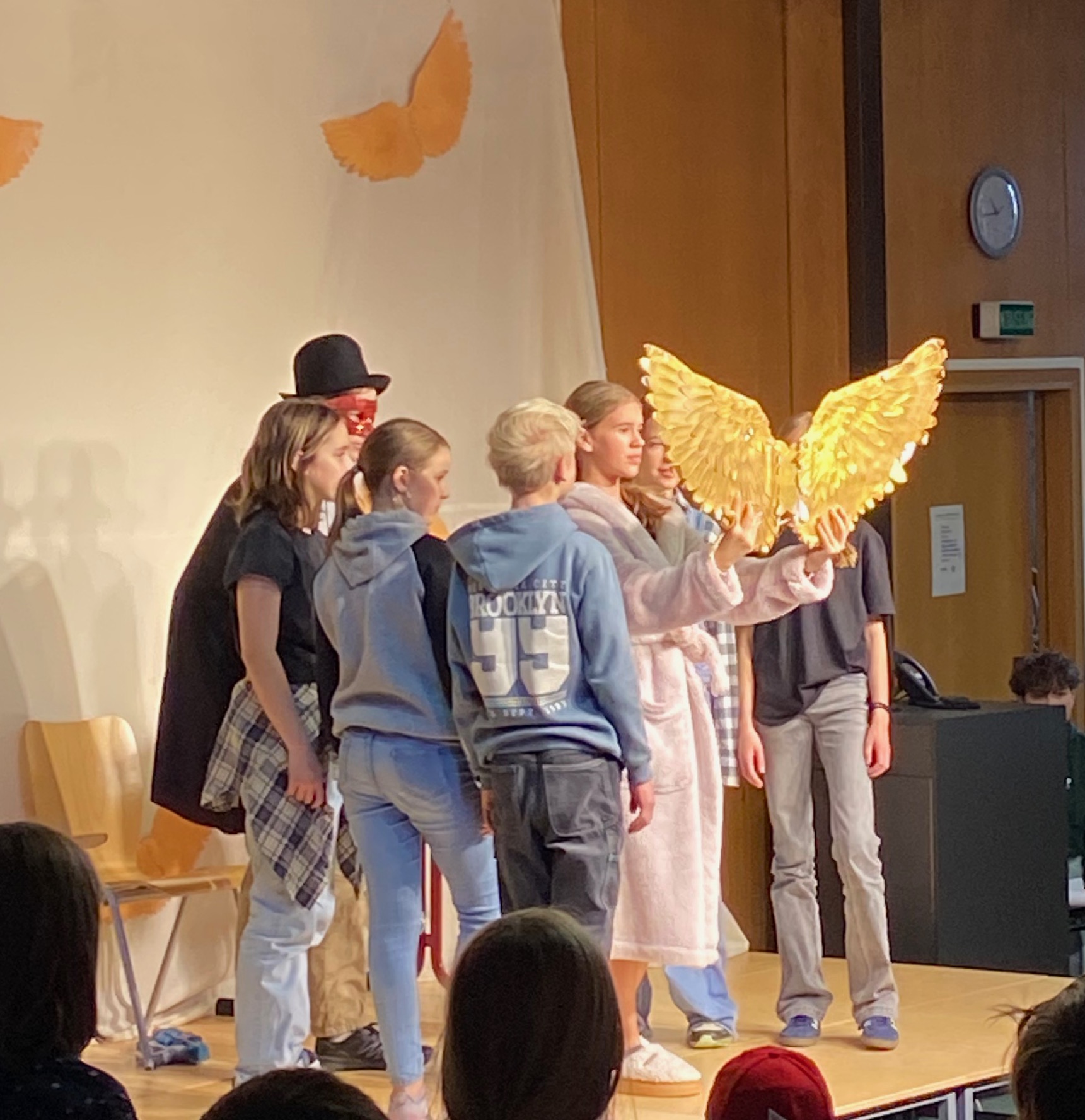 Das Bühnenbild, bestehend aus einer Leinwand mit goldenen Flügeln, auf der sich zwischenzeitlich ein Kinderkarussell drehte, und einem Unterschlupf voller Decken, schuf eine lebendige Atmosphäre und spiegelte die geheimnisvolle Welt der Geschichte wider. Für den passenden musikalischen Rahmen sorgte Kris-Milo P., der als Verantwortlicher für die Technik mit rasanten Musikeinspielungen die Spannung und Dynamik des Stücks wirkungsvoll unterstrich.