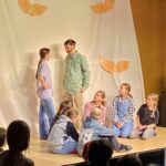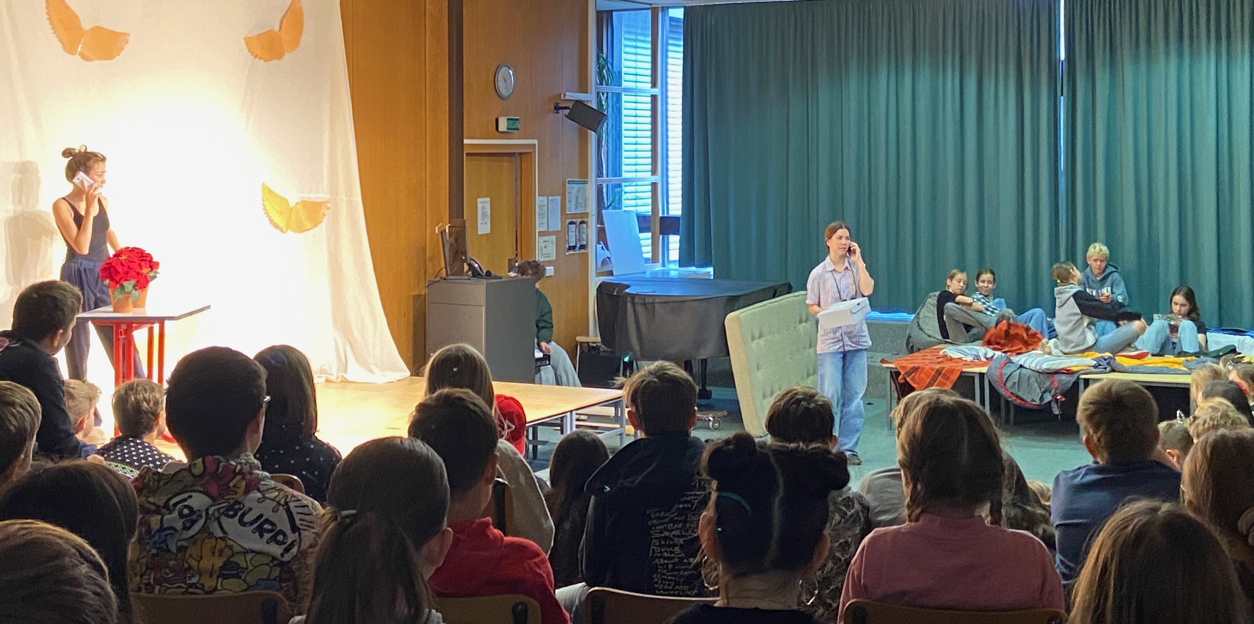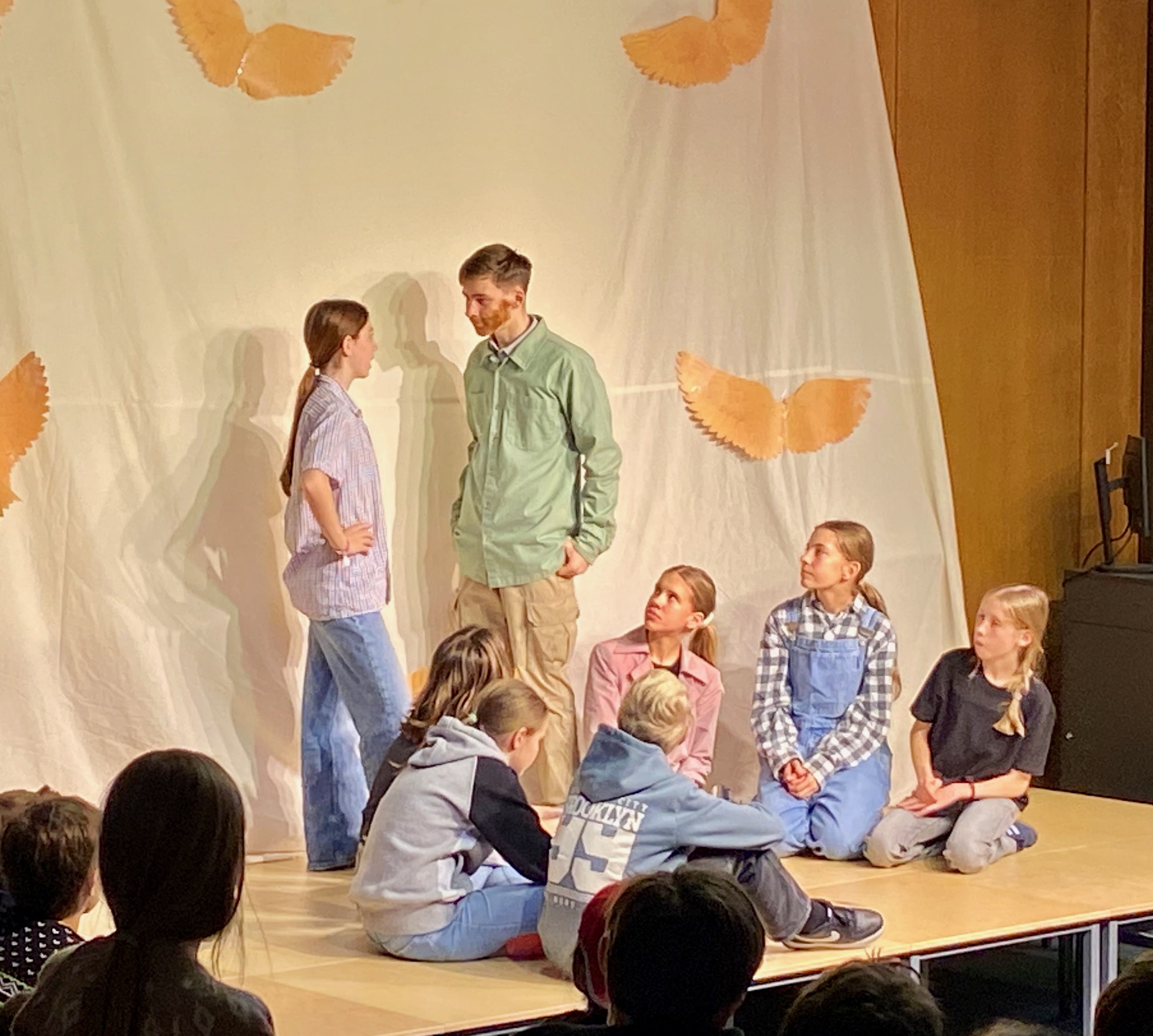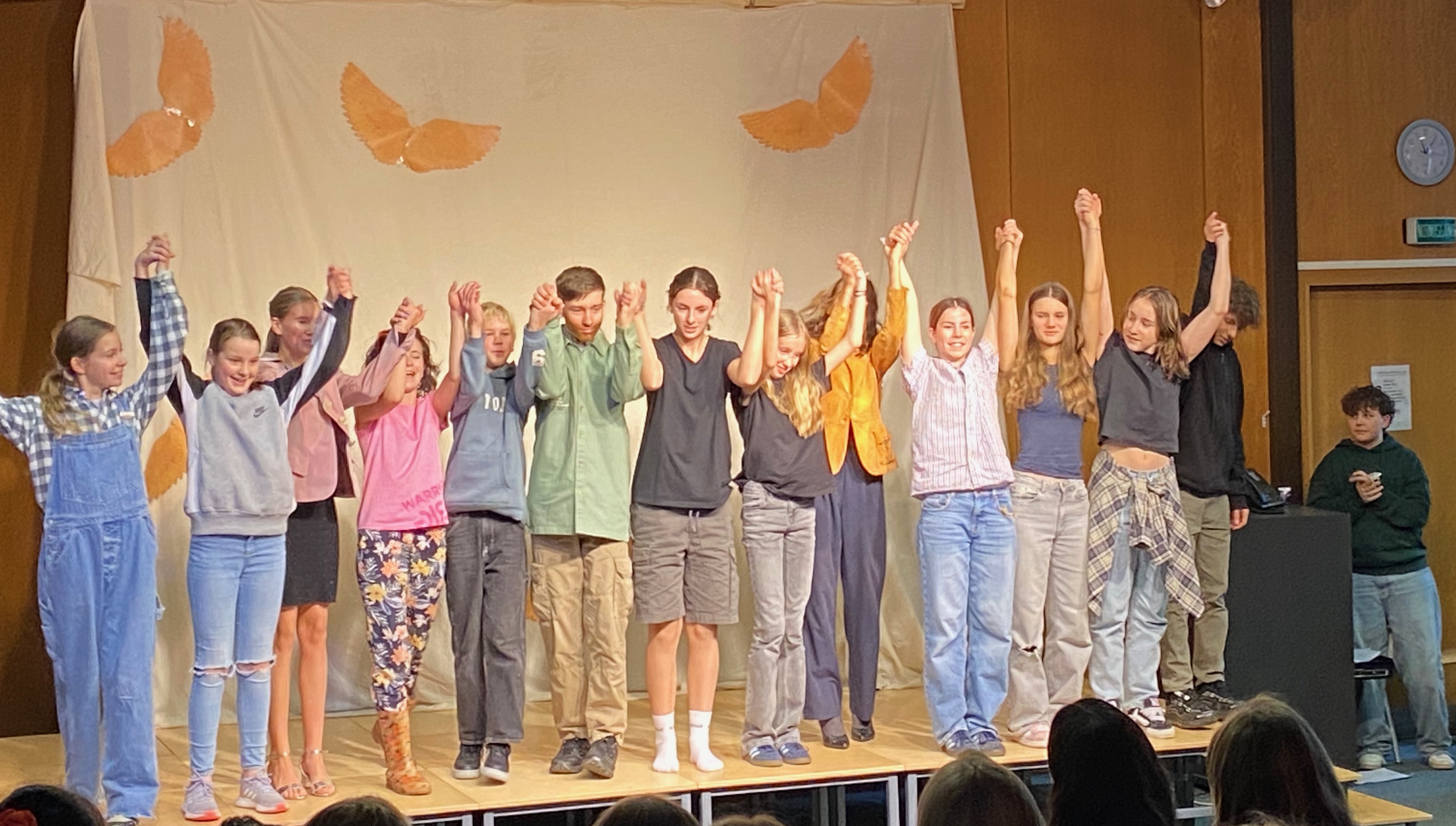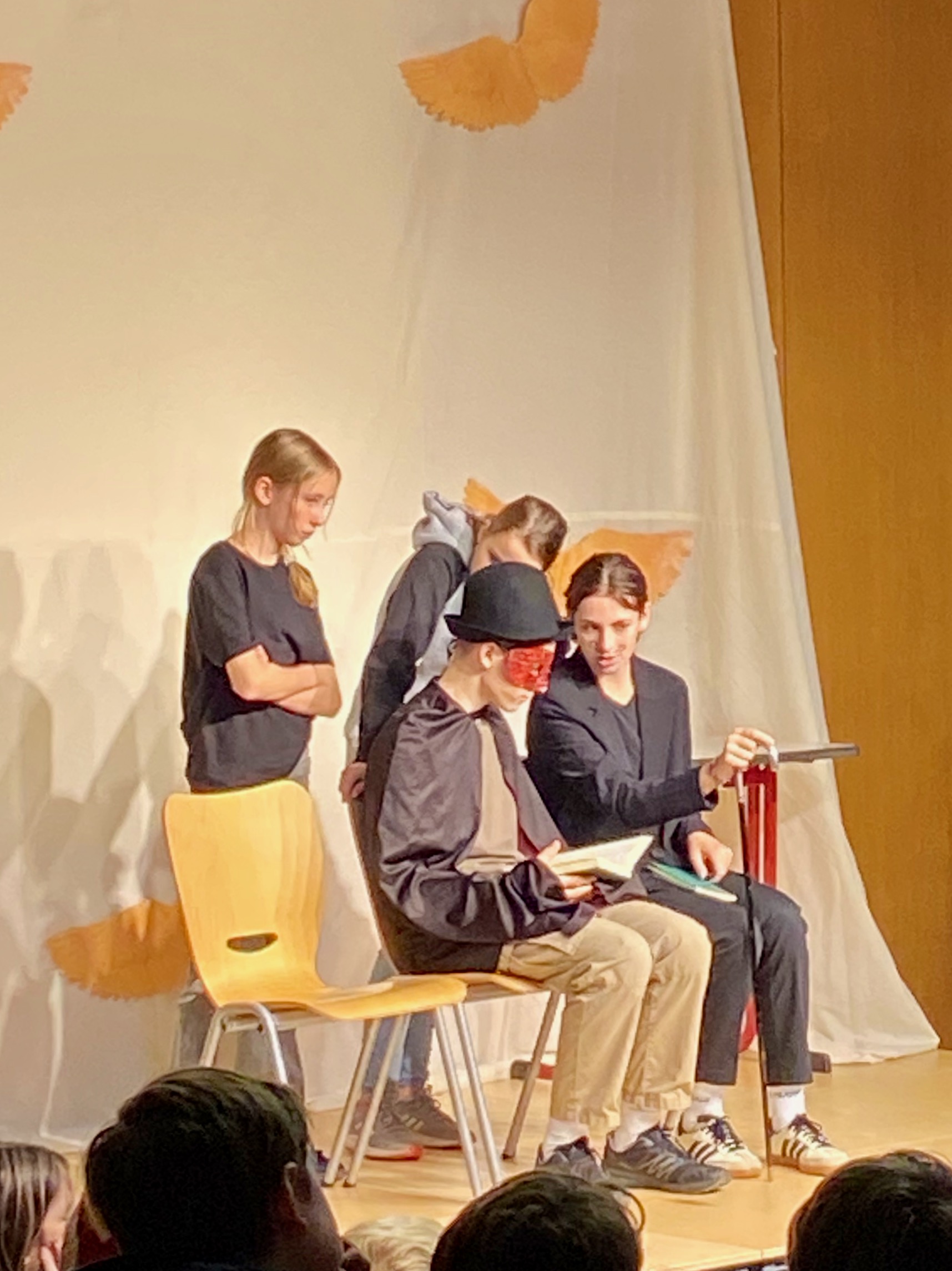 Helen H. als Ida und Tosca J. als Barbara zeigten starke Charaktere mit viel Ausdruck, während Melissa Sch. als Mosca und Sara S. als Riccia durch lebendige Dialoge überzeugten. Petra v. D. als Wespe und Elina M. als Prosper brachten charmante und zugleich tiefgründige Nuancen in ihre Figuren. Adam K. (Max) vertrat einen ernsthaften Charakter, während Denis K. (Bo) mit einer frechen Art das Publikum zum Lachen brachte. Besonders Lotte H. als Conte und Aaron Sch. als Scipio überzeugten mit starker Bühnenpräsenz und einem feinen Gespür für die emotionalen Wendungen des Stücks. Allegra Sch. (Dr. Massimo), Greta H. (Tante Esther) und Tamina D. (Victor) rundeten das Ensemble mit prägnanten, ausdrucksstarken Auftritten ab.