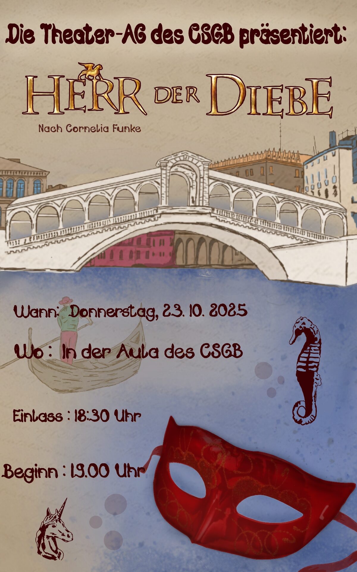 Hast du schon einmal davon geträumt, erwachsen zu sein? Oder wünschen Sie sich manchmal, wieder Kind zu sein? In „Herr der Diebe“, dem Theaterstück nach Cornelia Funkes Bestseller, werden diese Träume Wirklichkeit. Wie das möglich ist? Begleiten Sie die jungen Talente der Theater-AG des CSG nach Venedig und finden Sie es heraus – in einer Geschichte voller Geheimnisse, Freundschaft und Abenteuer.