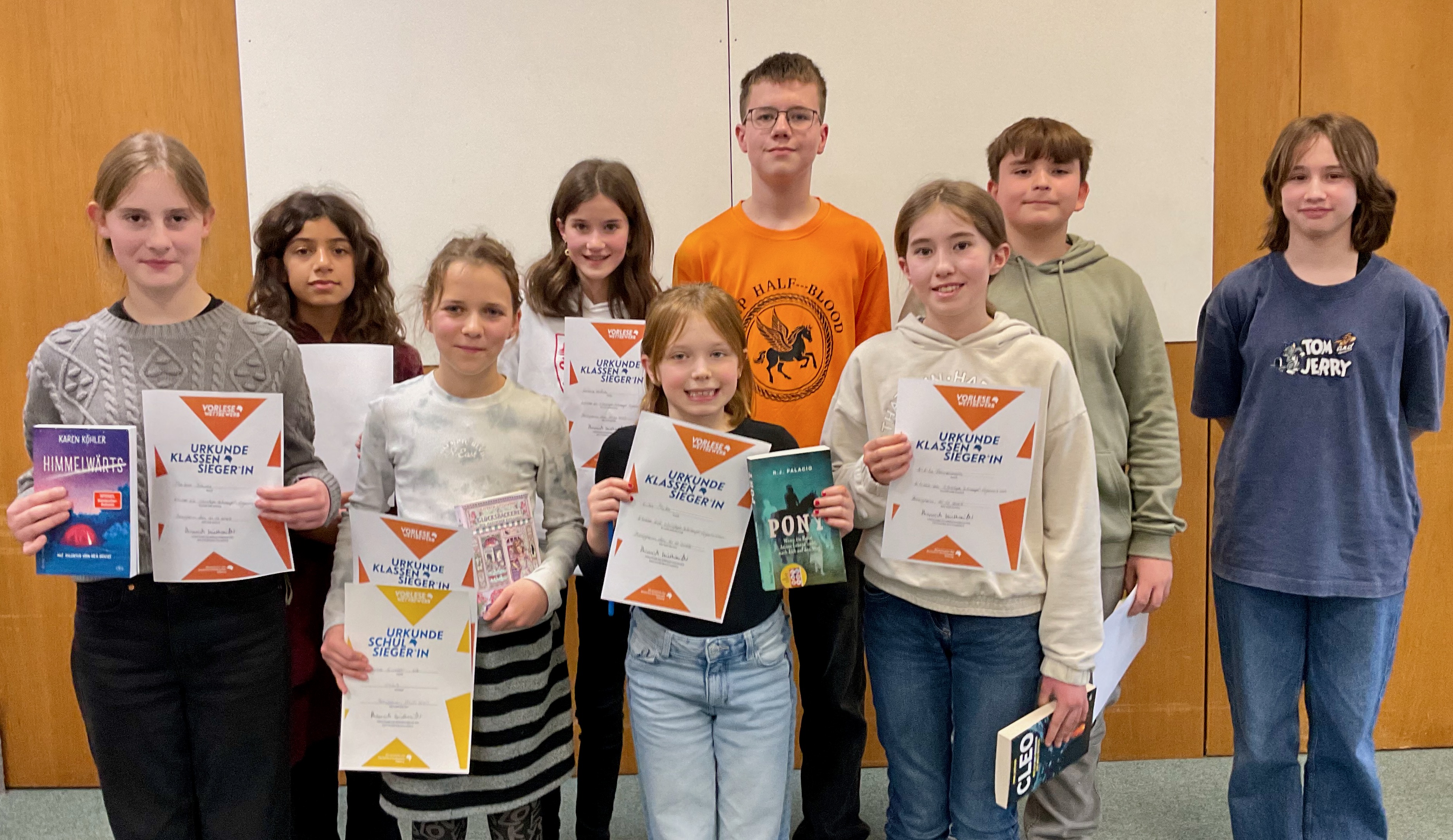 In der Aula fand in diesem Schuljahr der Vorlesewettbewerb der 6. Klassen statt. Vor der gesamten Jahrgangsstufe 6 traten insgesamt acht Schülerinnen und Schüler an und bewiesen dabei nicht nur ihre Lesefähigkeiten, sondern auch großen Mut. Für die Klasse 6a lasen Nikita und Leo, die 6b wurde von Bastian und Marlene vertreten. Aus der 6c nahmen Sofia und Helene teil, während Lisa und Carolina für die 6d antraten.